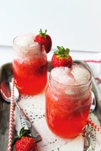 This strawberry float couldn’t be easier to assemble. Just puree the strawberries with some 7-up and divide it between two glasses. Pour in a little more pop or soda (whichever you prefer to call it) top it with a scoop (or two 🙂 I’m just saying) of strawberry ice cream and enjoy!