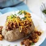 In a large skillet brown hamburger until no longer pink over medium heat. Drain any grease. Add in taco seasoning, beans, tomatoes, tomato sauce and water. Simmer for 5 minutes then serve over baked potatoes.